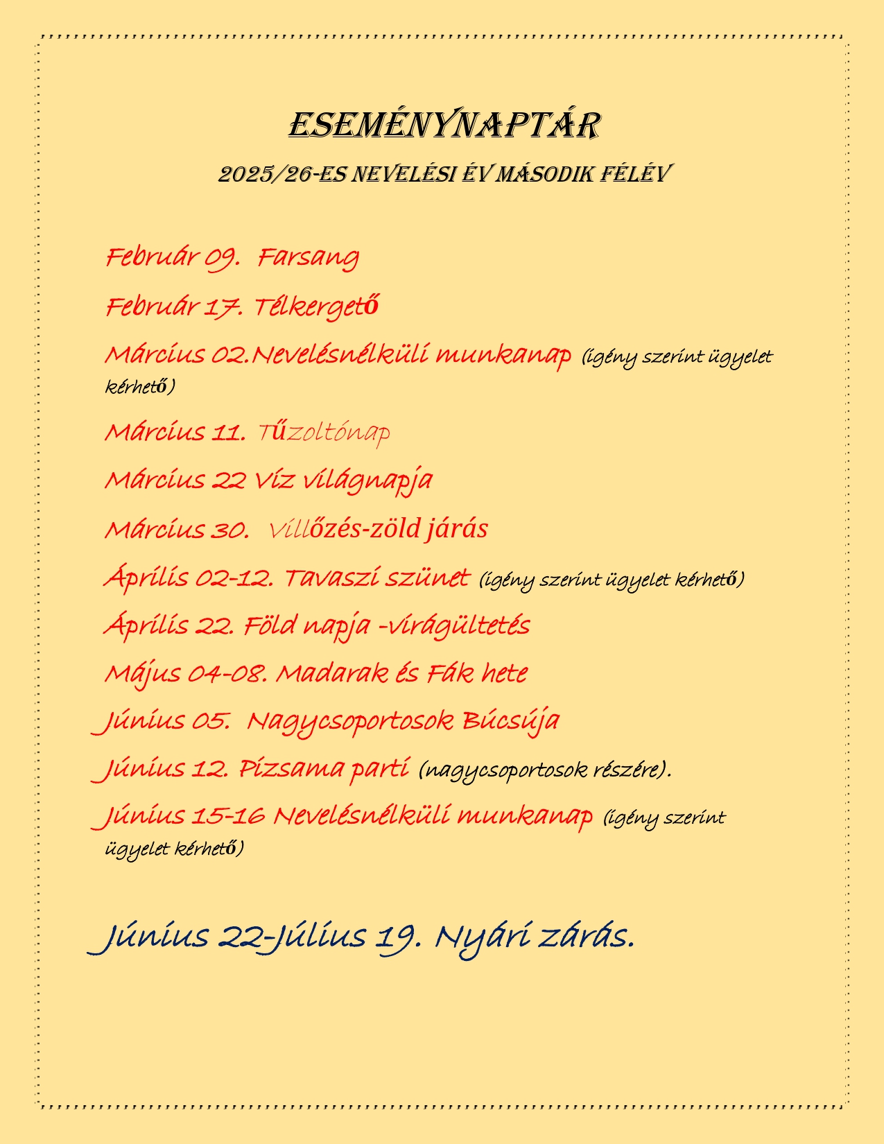 Eseménynaptár 2025/26-es nevelési év második félév Szerző: Vecsési Tündérkert Óvoda | febr 11, 2026 | Hírek